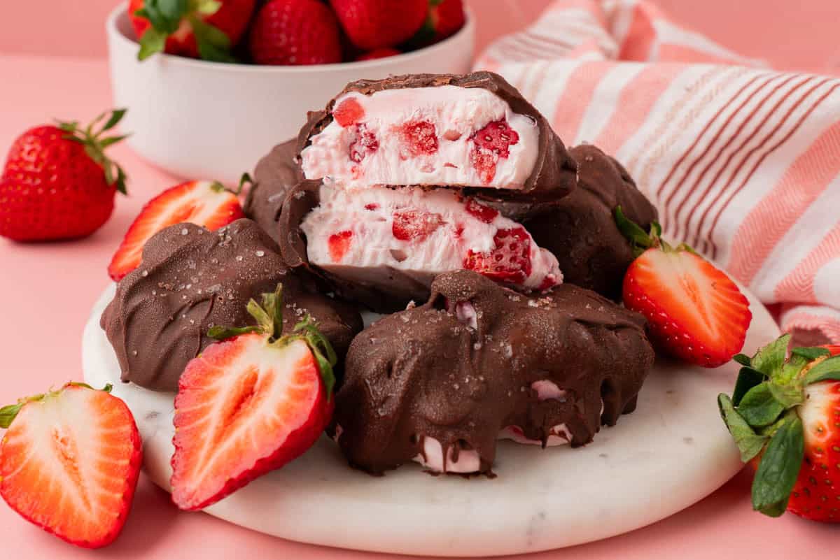 These Chocolate Covered Strawberry Yogurt Bites are the perfect frozen treat when you want something sweet but not heavy. Made with fresh strawberries, creamy yogurt, and coated in a crisp chocolate shell, they deliver the ultimate creamy-meets-crunchy bite.