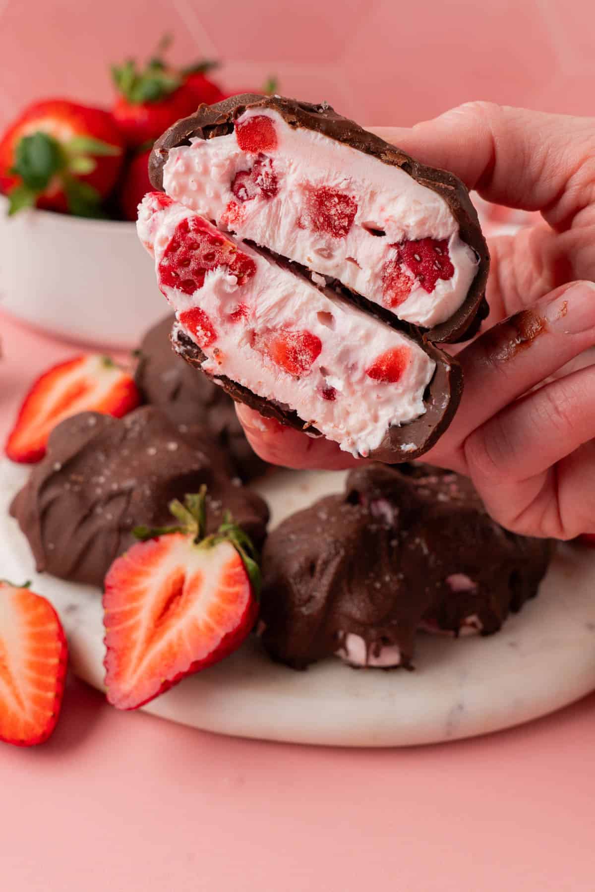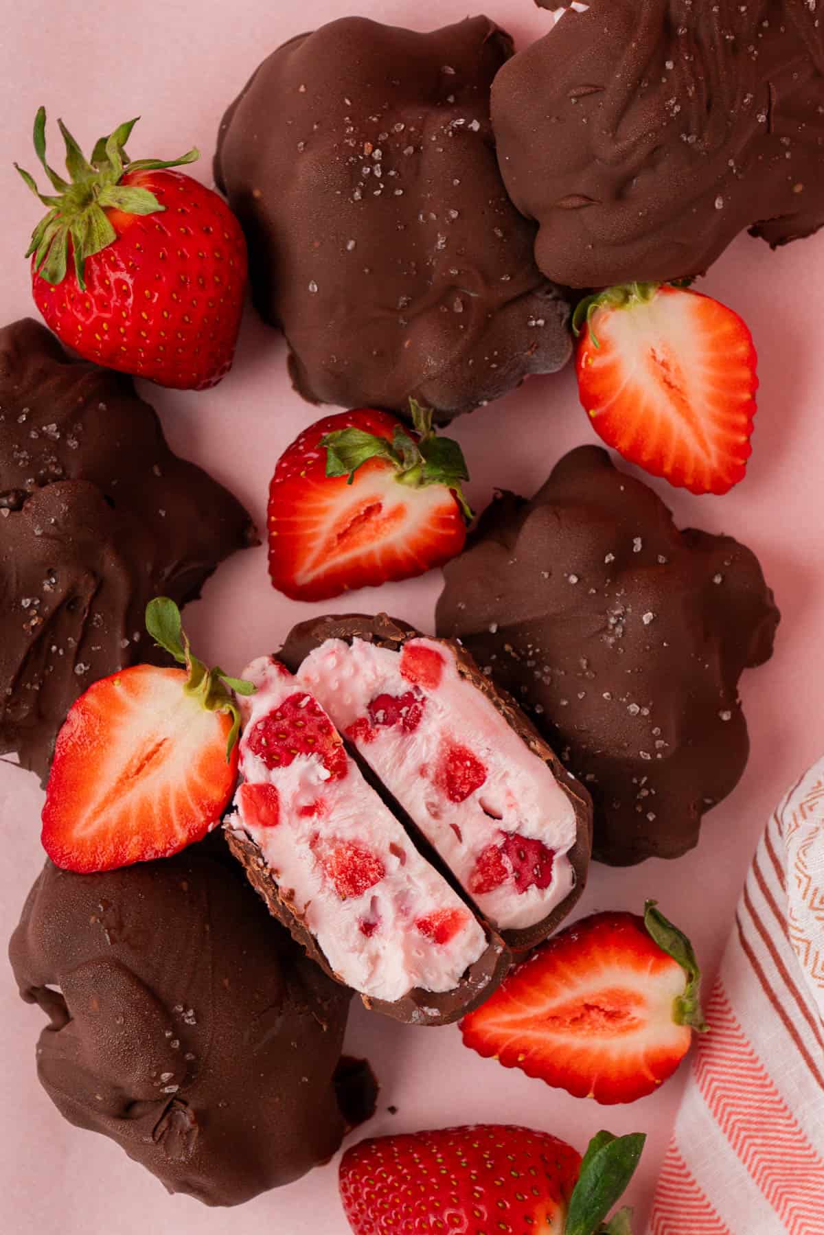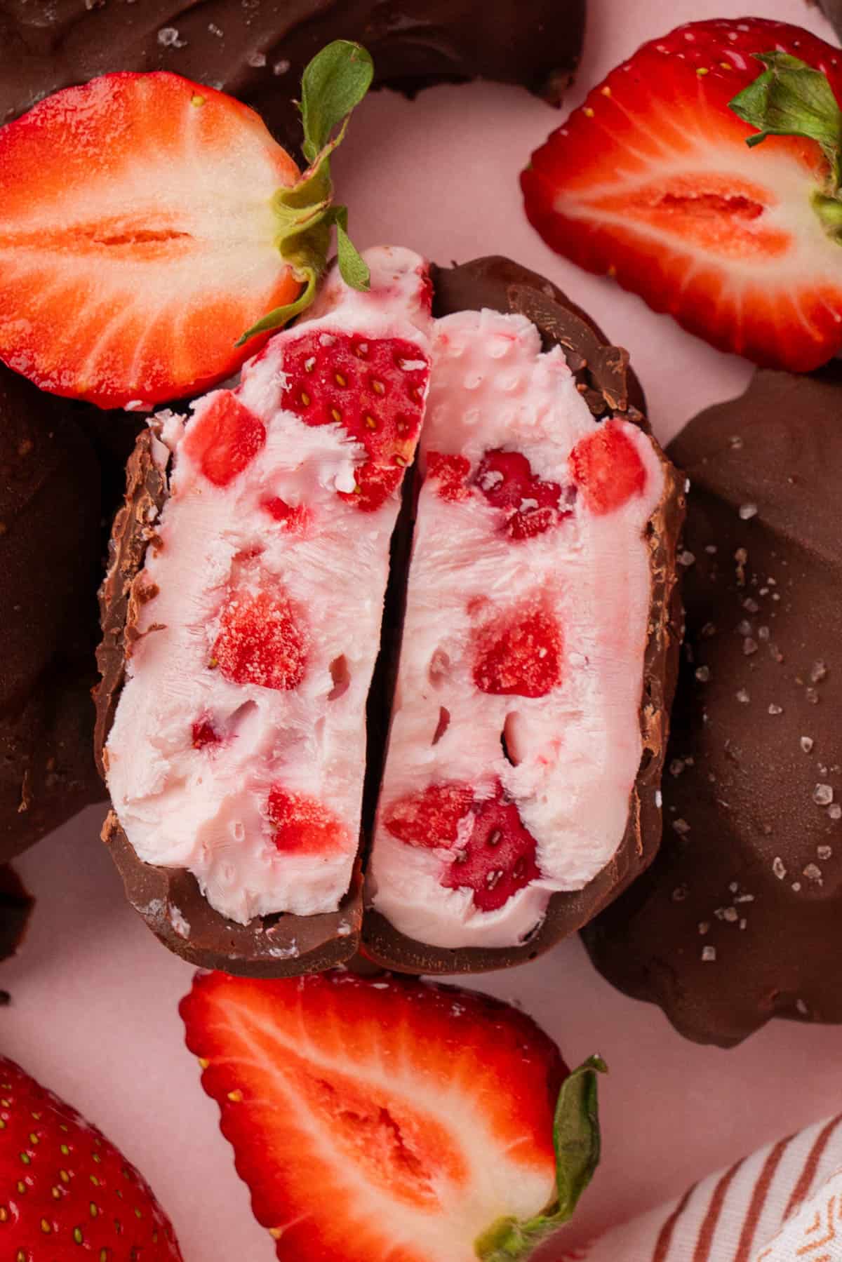 These strawberry yogurt chocolate bites have a creamy center and crisp chocolate exterior, making them a refreshing and satisfying treat.