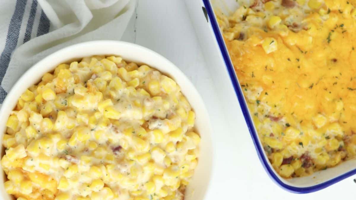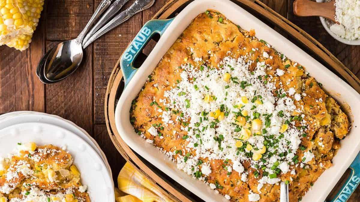 This Cheesy Corn Casserole recipe is perfect as a side dish. Packed full of sweet and savory flavors there is a little bit of everything in this creamy corn casserole.