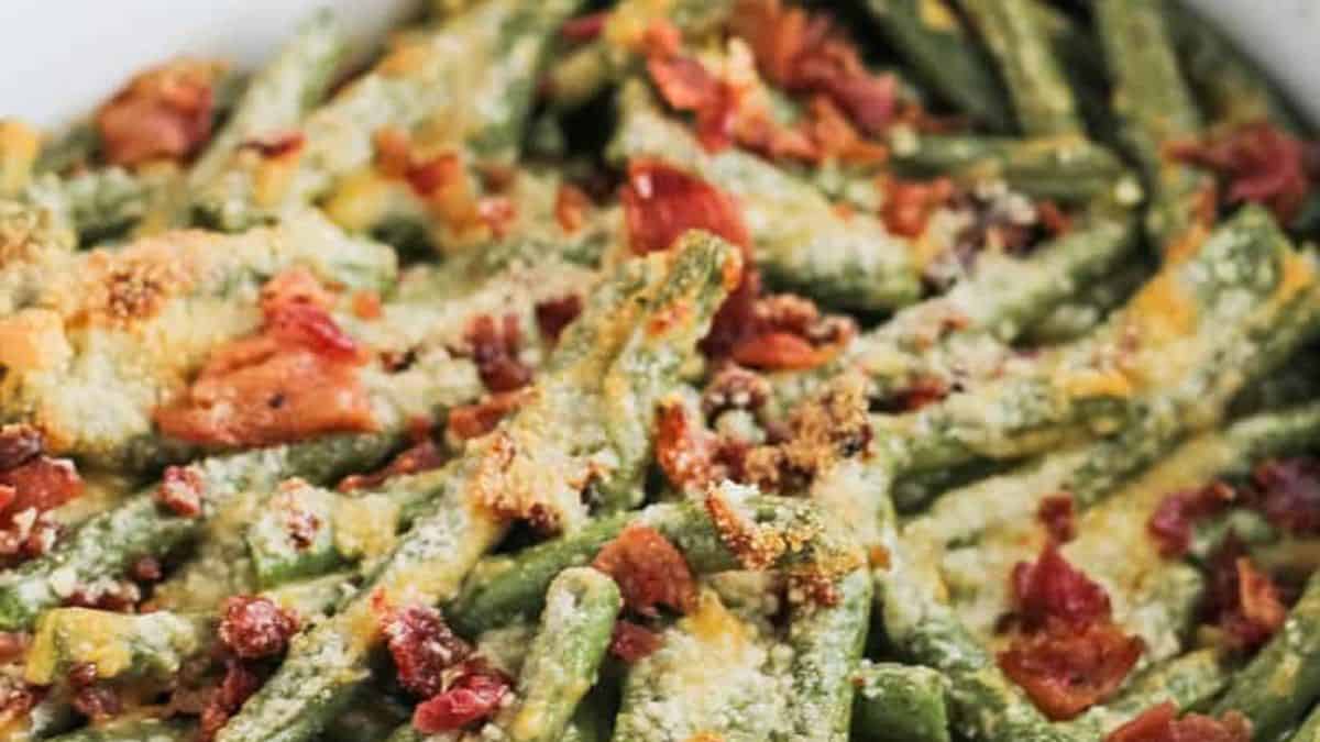 This Cheesy Green Bean Casserole is a twist on the classic dish. Fresh green beans, cheese, cream, bacon, and seasonings make for a tasty side dish perfect for fall and Thanksgiving.