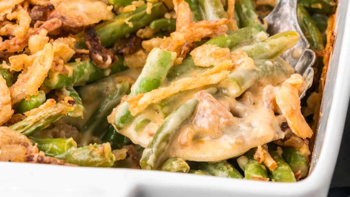 This green bean casserole is better than the original version. It is made with fresh green beans and a creamy scratch made sauce instead of canned.
