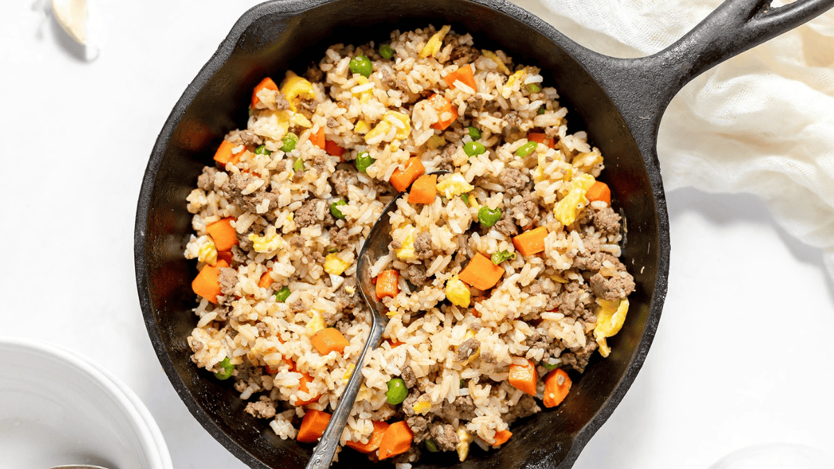 This Ground Beef Fried Rice takes less than 30 minutes to make! Made with stir-fried ground beef, peas, leftover rice, scrambled eggs, soy sauce, and rice vinegar it is delicious.