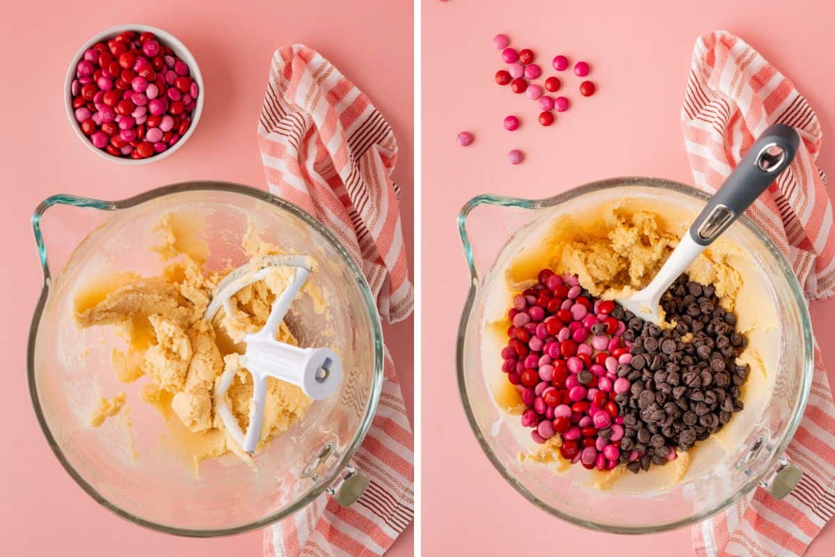 - Fold in the M&M candies and chocolate chips using a spatula.
