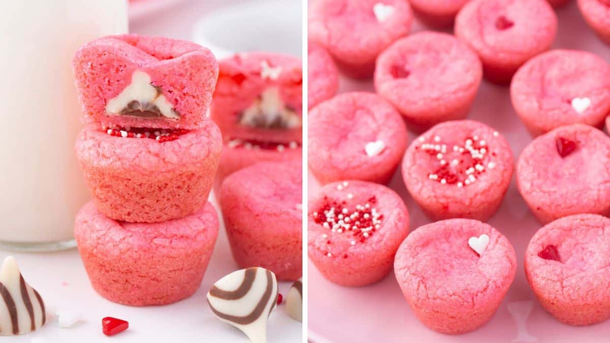 These Valentine’s Day Cookie Cups are simple, semi-homemade sweet treats with a hidden chocolate inside each cookie. This easy-to-make recipe uses a sugar cookie mix with just 4 basic ingredients. Yum!