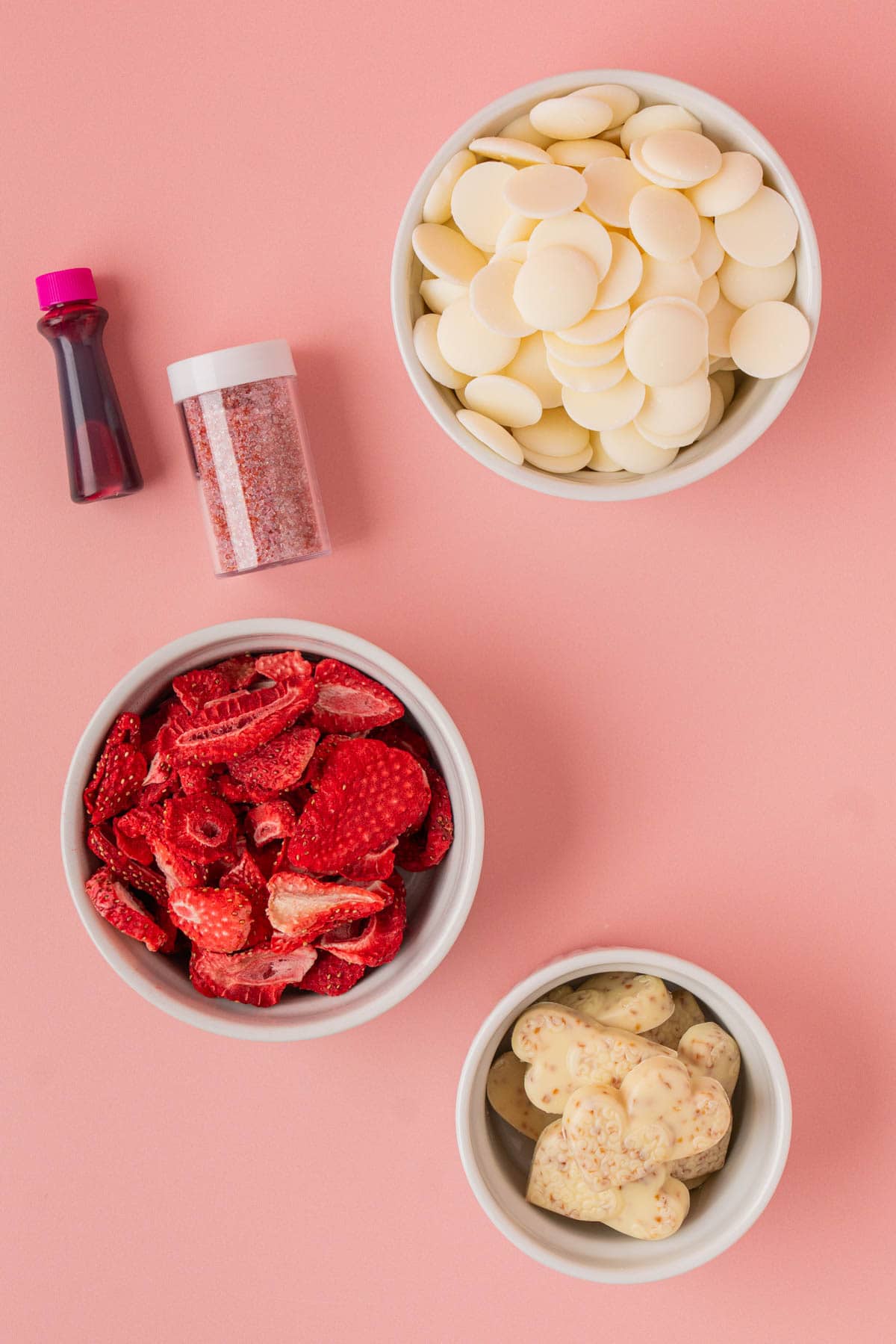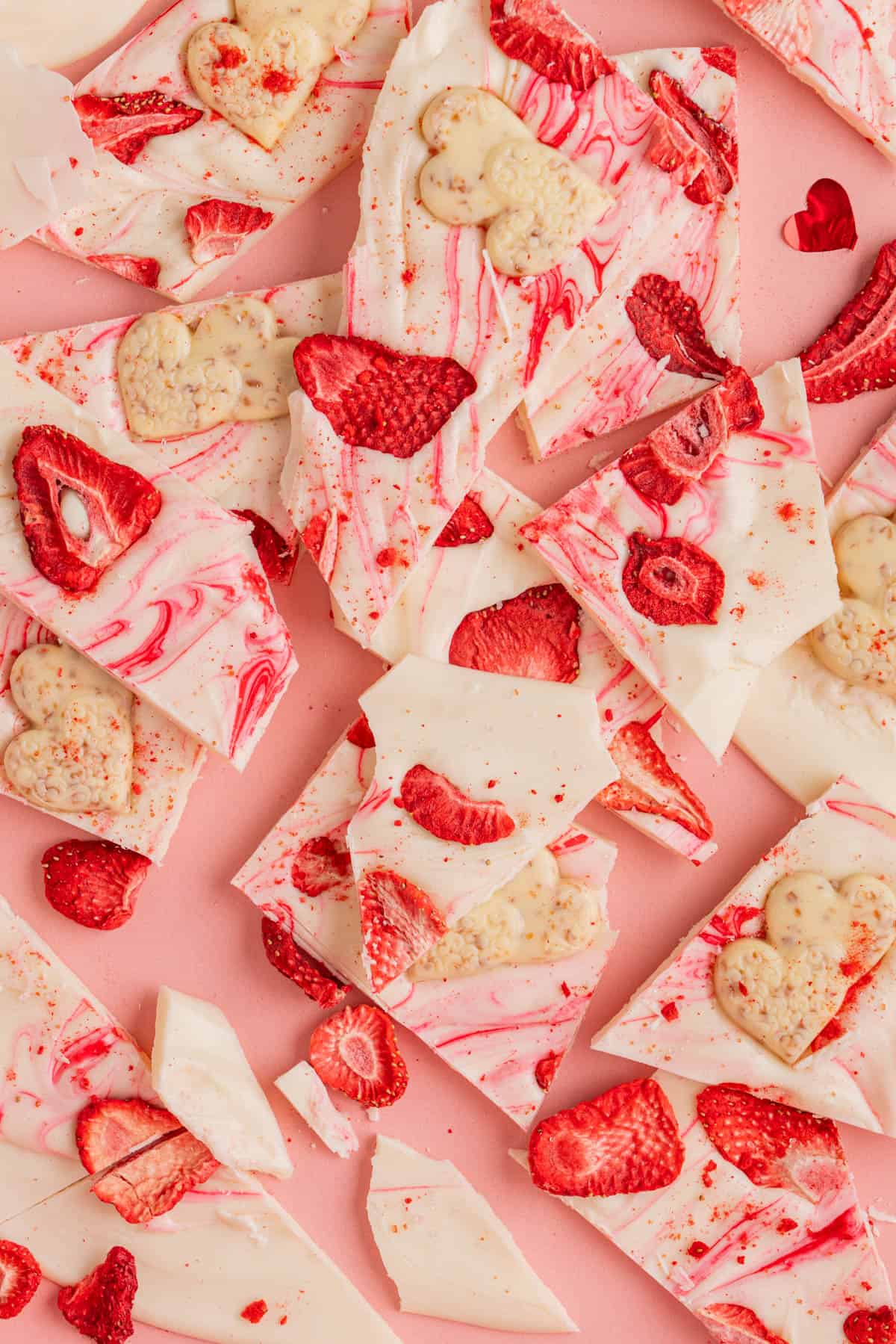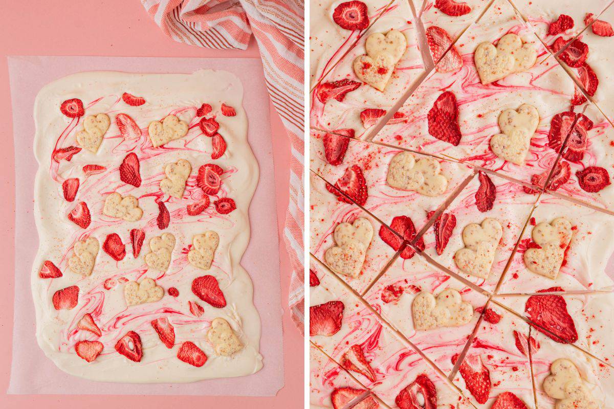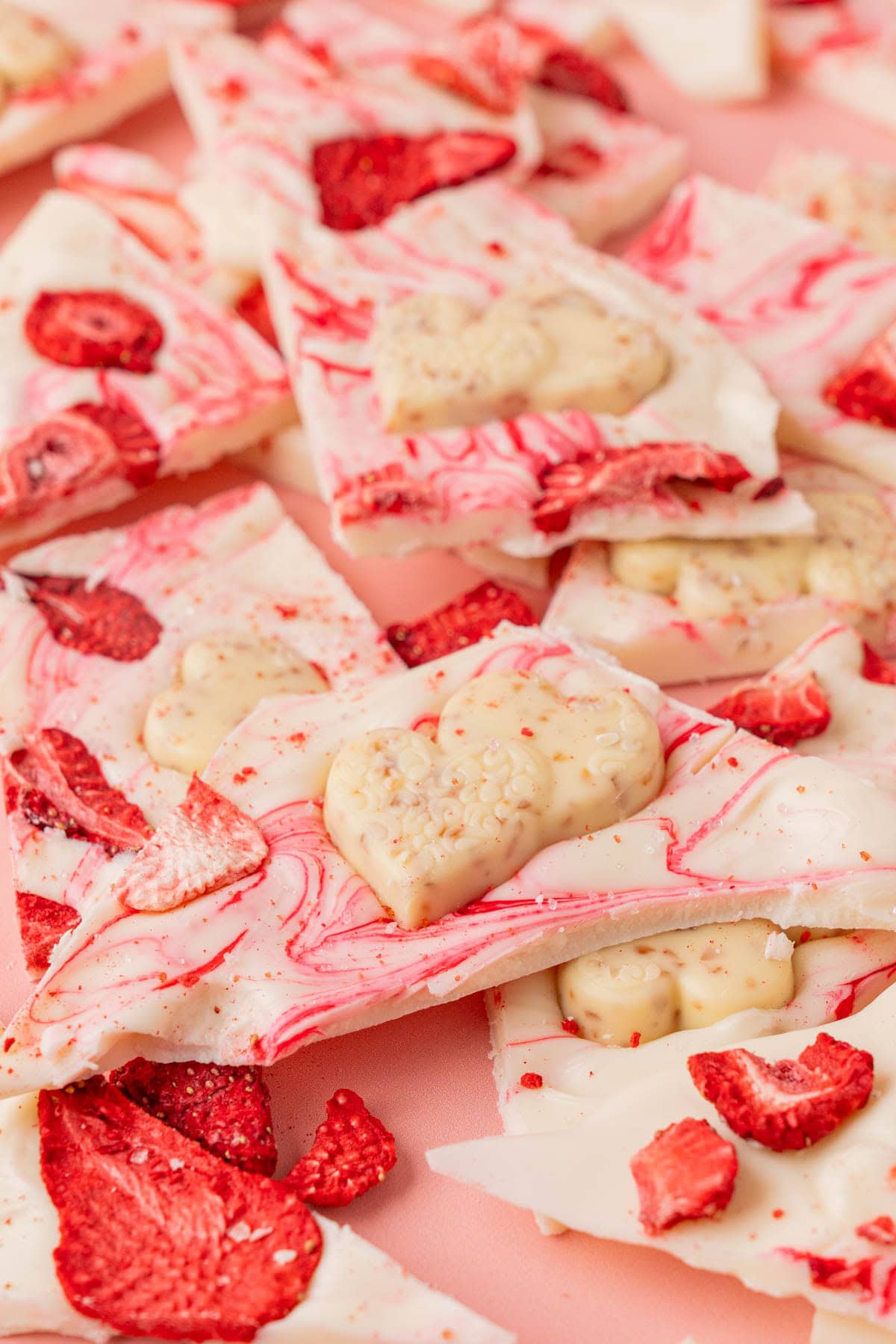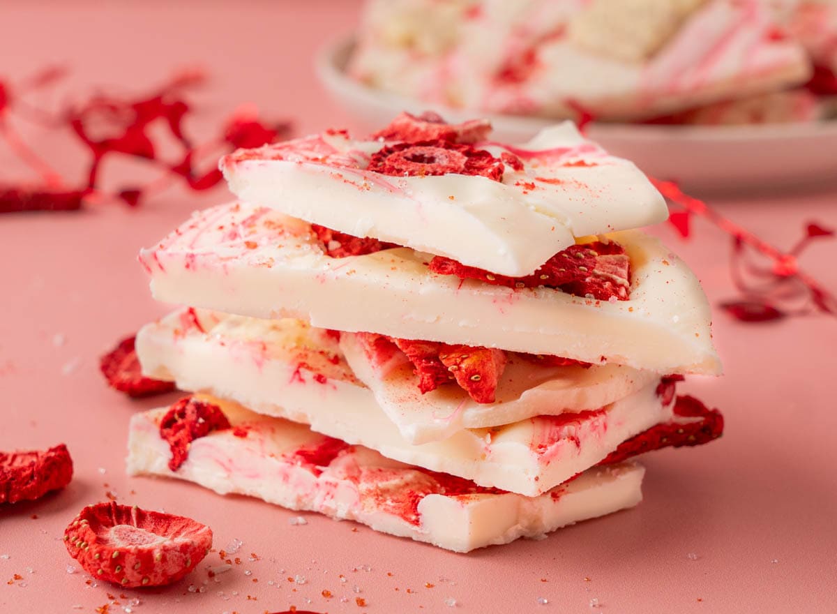 Freeze-dried strawberries: These add bright strawberry flavor without moisture. Fresh strawberries would release water, preventing the bark from setting properly.