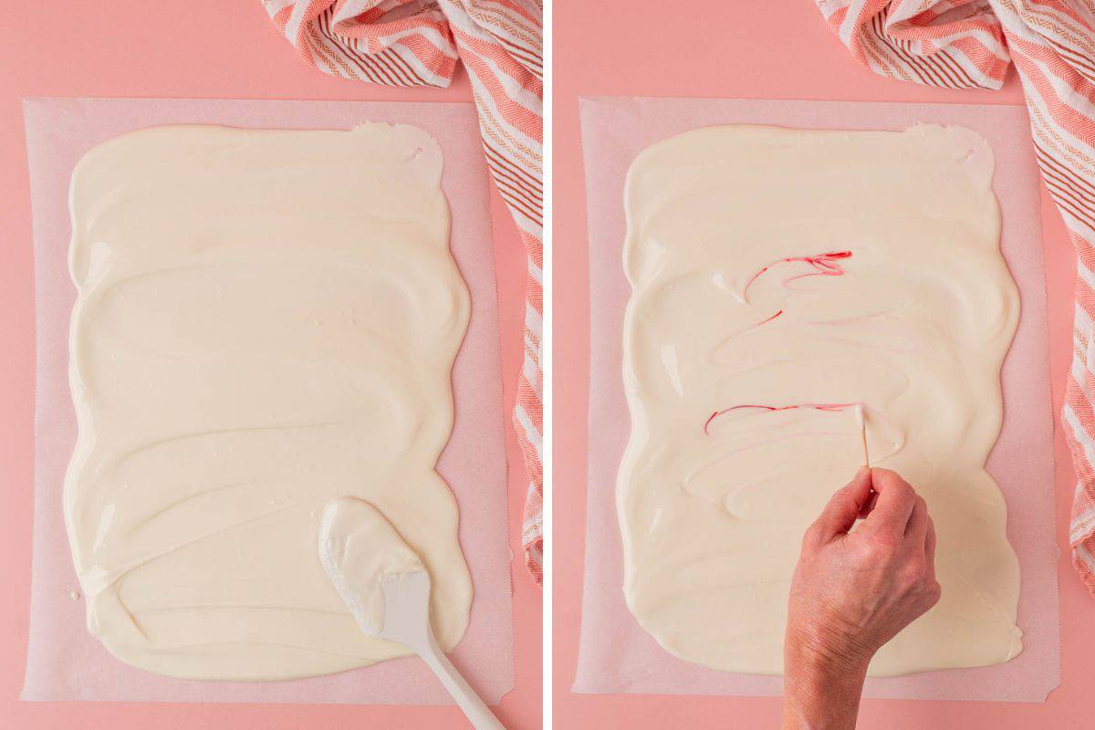 Spread evenly by pouring the melted chocolate onto a parchment-lined baking sheet. Use a spatula to spread it into an even layer about ¼ inch thick. Work quickly, as white chocolate firms up fast.