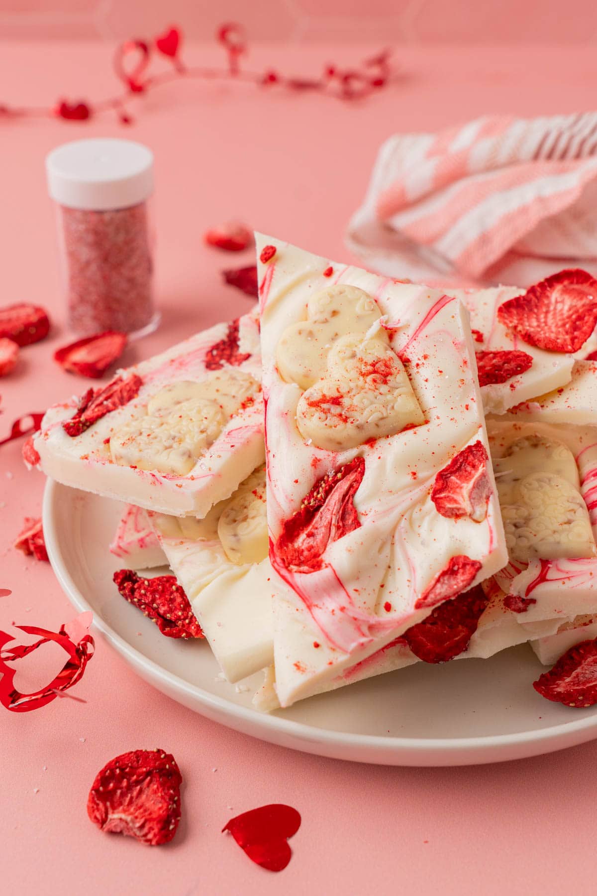 This strawberry white chocolate bark can be made a few days in advance. Once fully set, store them in an airtight container until ready to serve.