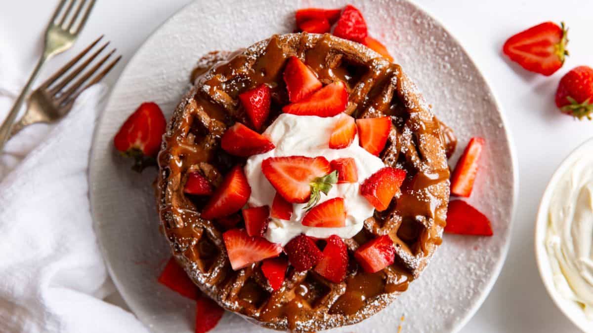 These chocolate waffles are topped with Nutella for a rich and indulgent treat. These waffles can be eaten for breakfast, brunch or dessert!
