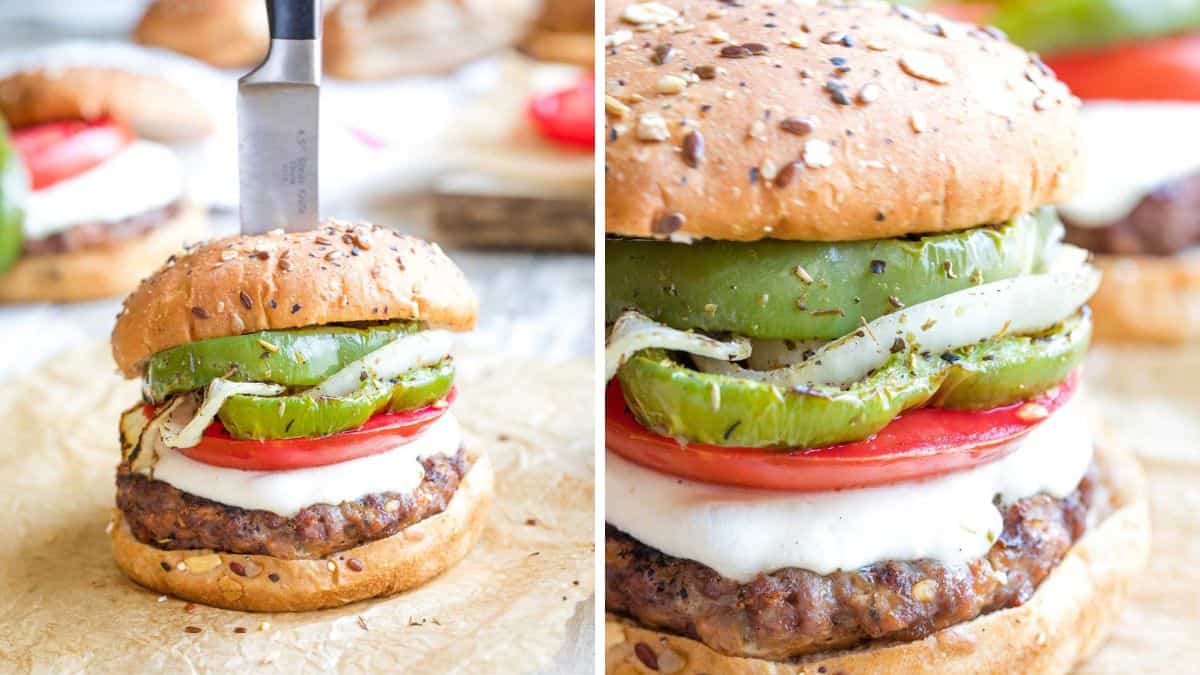 These Italian Grilled Hamburgers feature a mix of ground beef and Italian sausage. All seasoned with savory Italian spices, grilled peppers and onions, juicy tomato, and a slice of fresh mozzarella. Super easy to make as well.